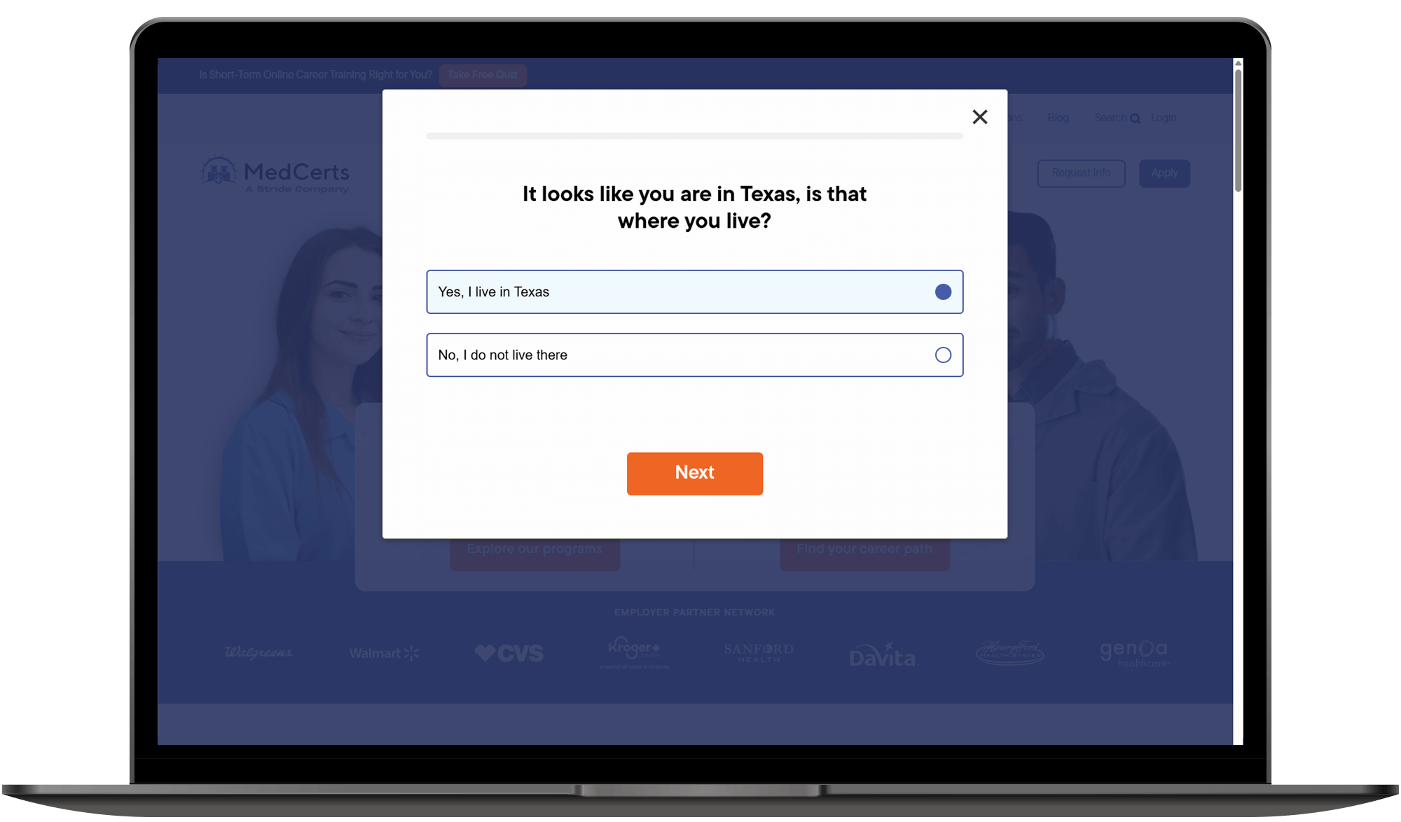 The program selection quiz asks users a series of questions that correspond with filter selections. Upon completion the user is landed on a program index page that is pre-filtered to display programs based on their selections.