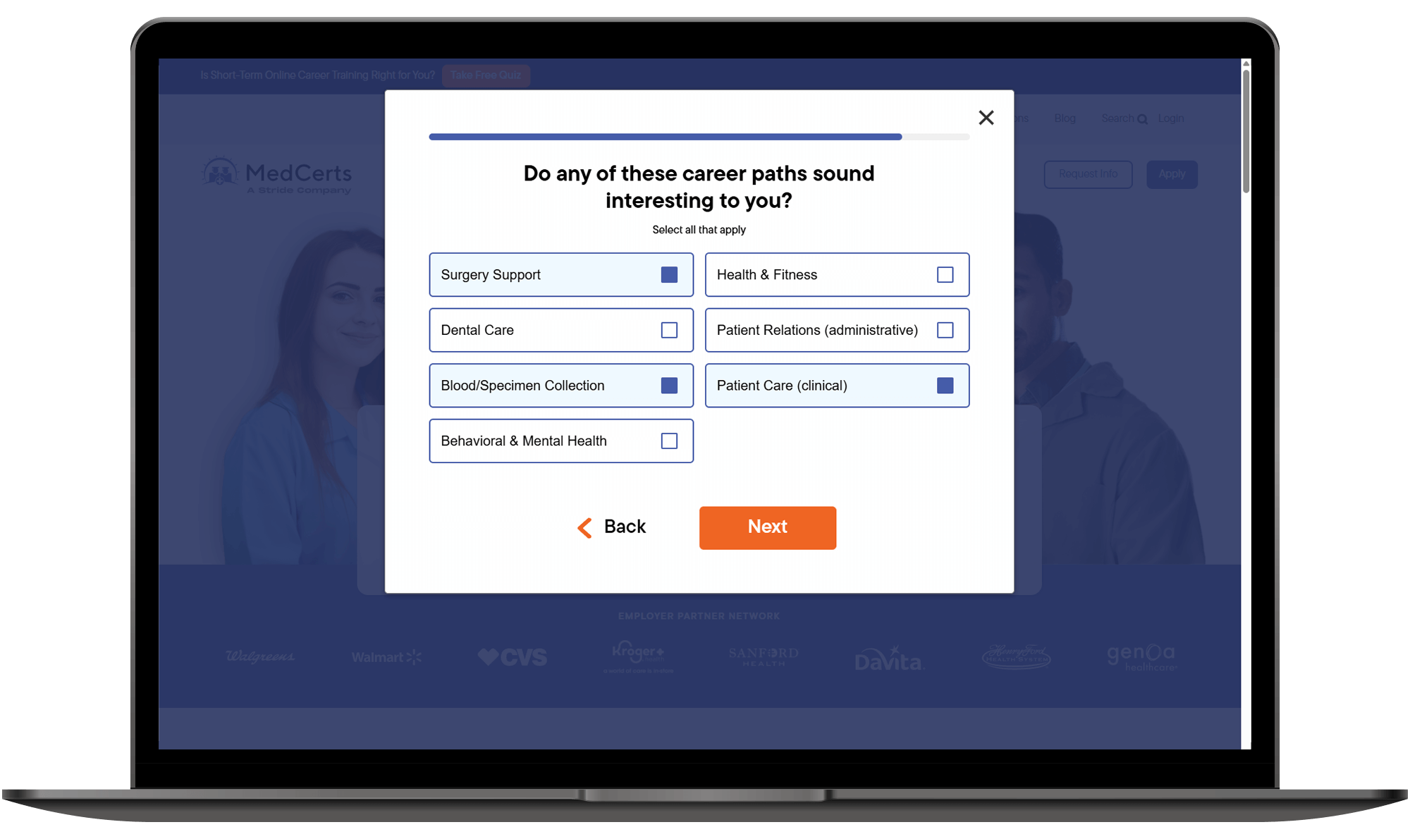The program selection quiz asks users a series of questions that correspond with filter selections. Upon completion the user is landed on a program index page that is pre-filtered to display programs based on their selections.